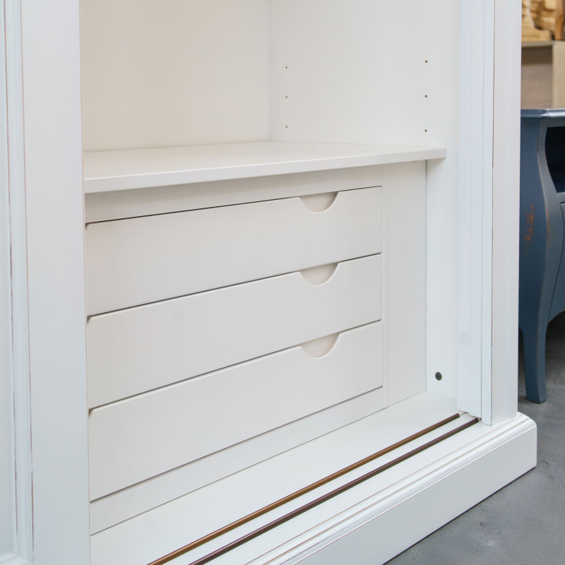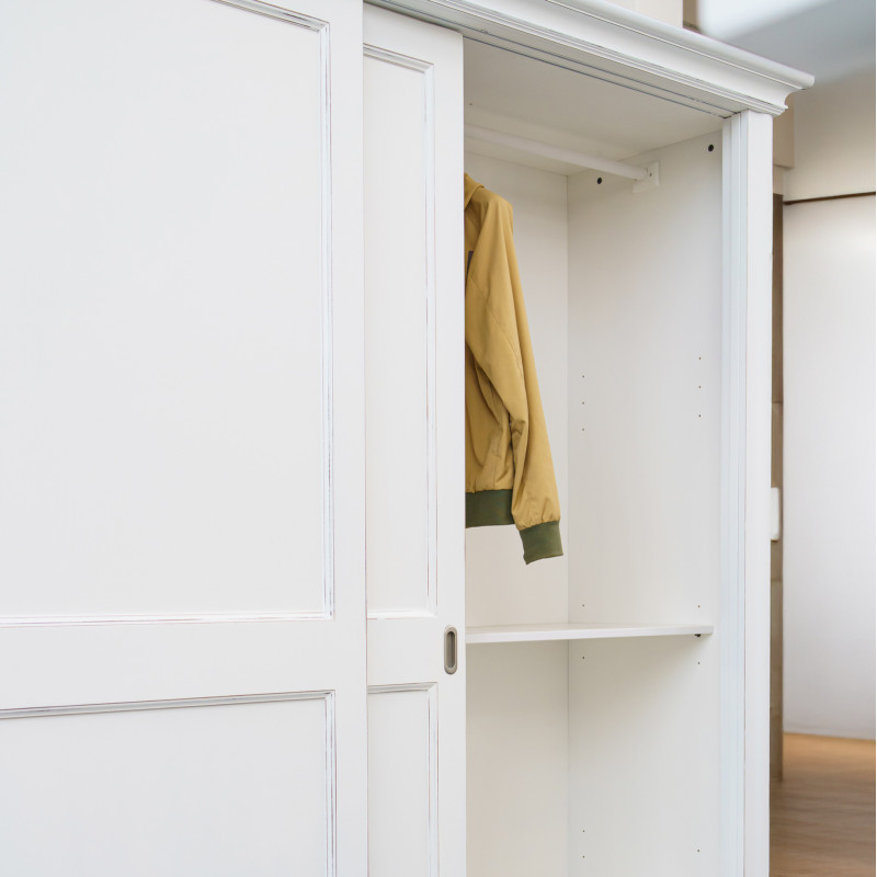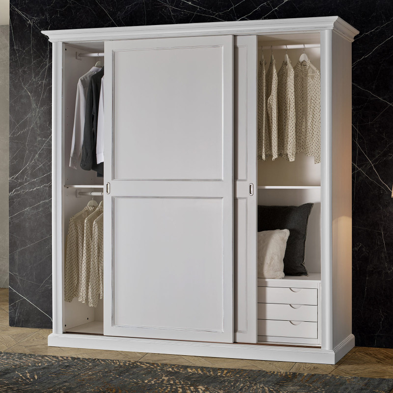 Armadio classico con due ante scorrevoli a doppio riquadro. Cappello e basamento sporgenti dal corpo del mobile. Questo mobile può essere utilizzato per arredare una camera da letto classica, in particolar modo quando viene realizzato con finiture in tinta legno. Per avere una camera da letto dal sapore attuale, con arredamenti in stile contemporaneo, si possono utilizzare finiture laccate e colorate.