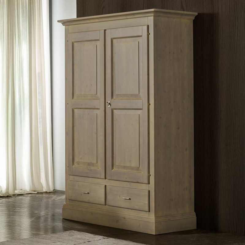 Questo armadio in legno massello di abete rappresenta un perfetto equilibrio tra funzionalità e sobria eleganza. Caratterizzato da due ante bugnate e due cassetti inferiori, offre ampio spazio contenitivo per organizzare abiti, biancheria e accessori, garantendo ordine e praticità.