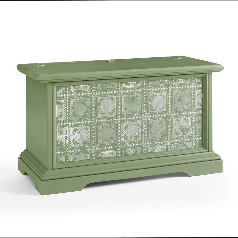 Cassapanca con frontale elegante, in legno massello, decori in rilievo. Stile classico intramontabile.
