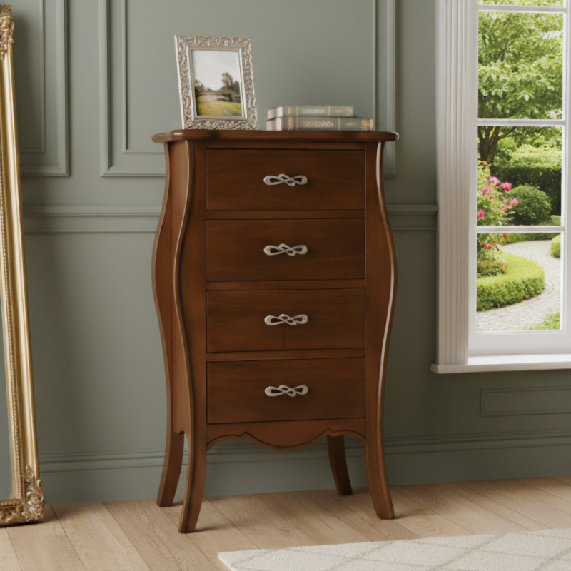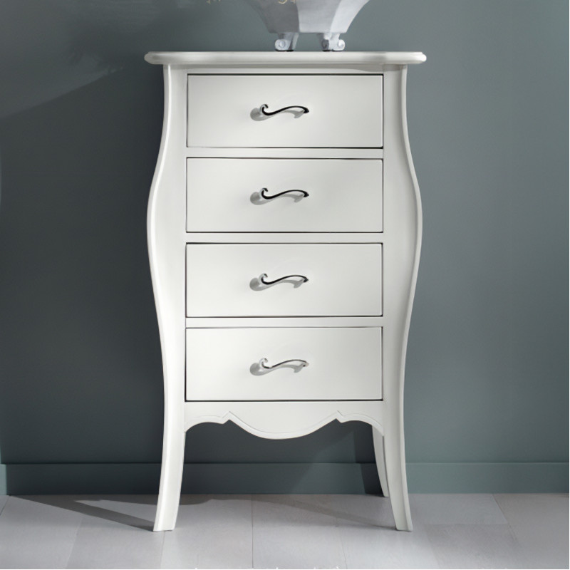 Cassettiera con quattro cassetti con spalle sagomate e fianchi diritti, gambe curve che proseguono con un grembiale sagomato. Questa cassettiera si presta ad essere utilizzata nella camera da letto, nel bagno o nel soggiorno di casa.