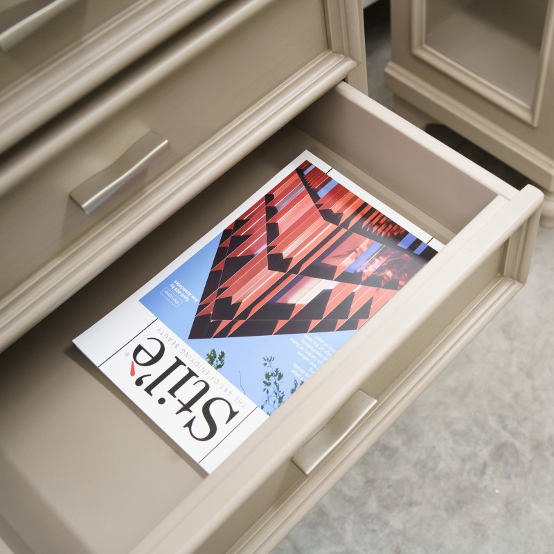 Questi articoli si prestano ad essere ad essere realizzati con diverse finiture, dalle classiche tinte legno alle più attuali laccature colorate. Sono disponibili classiche finiture in tinta noce e ciliegio, eventualmente patinate o anticate. Scegliendo invece colori laccati, eventualmente leggermente invecchiati, è possibile realizzare questi mobili con un gusto provenzale, country o shabby chic. Molto piacevole ed utilizzato il laccato bianco leggermente spigolato. Sui mobili intarsiati sono consigliate finiture in tinta legno che evidenziano il disegno realizzato delle diverse essenze di legno, mentre sono sconsigliate le laccature coprenti.