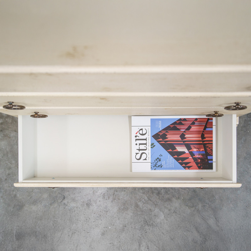 Questi mobili sono disponibili con tenui colori che evidenziano la venatura del legno. Sono disponibili il rosa, l’azzurro, il verde, il blu e il bianco spazzolato. Questi colori sono visibili tra le immagini aggiuntive. Altri colori sono disponibili a richiesta. Sono disponibili diverse alternative di maniglie, senza variazioni di prezzo. I modelli disponibili sono il pomolo in porcellana, il pomolo a bottone, il pomolo a fiore e la maniglia zigrinata.