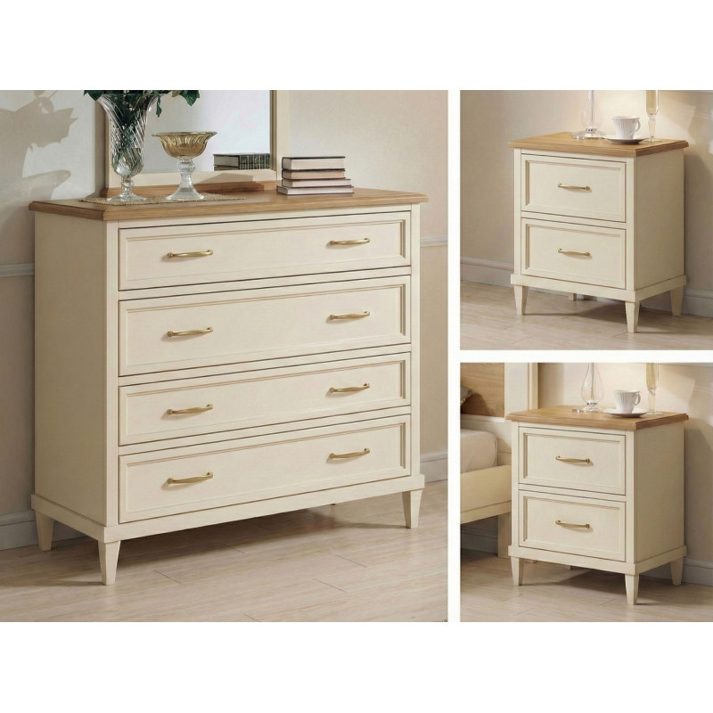 Gruppo notte completo, composto da un capiente comò e comodini coordinati. Perfetto per chi ama le atmosfere calde e accoglienti, questo set si distingue per le sue linee pulite ma ricche di dettagli artigianali, capaci di integrarsi armoniosamente sia in ambienti classici che in contesti più contemporanei o country-chic.