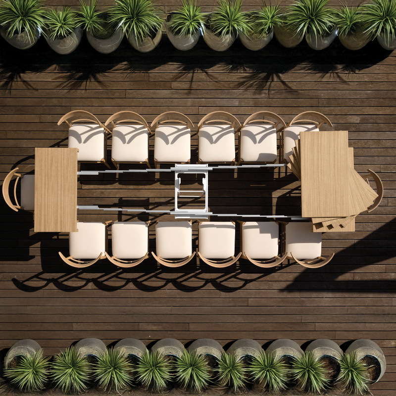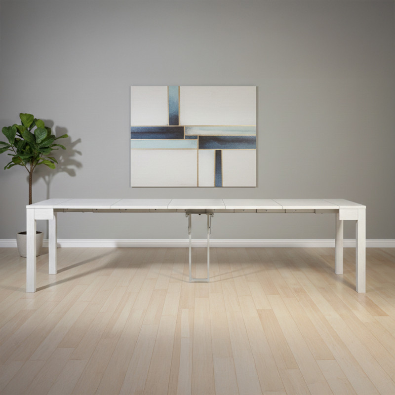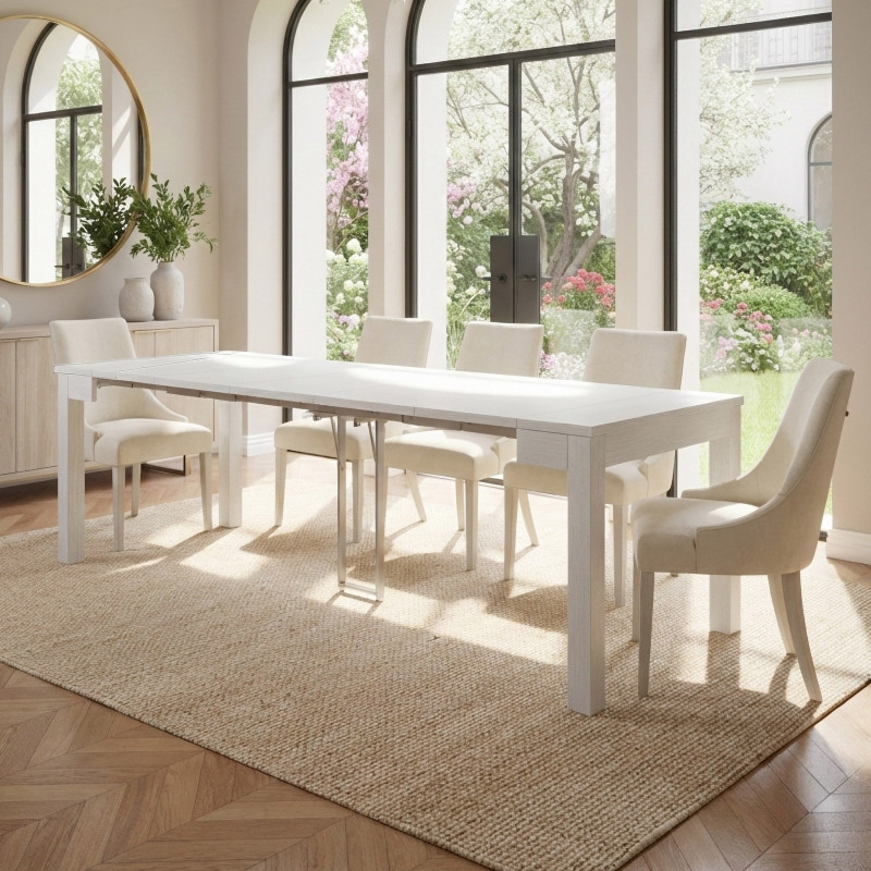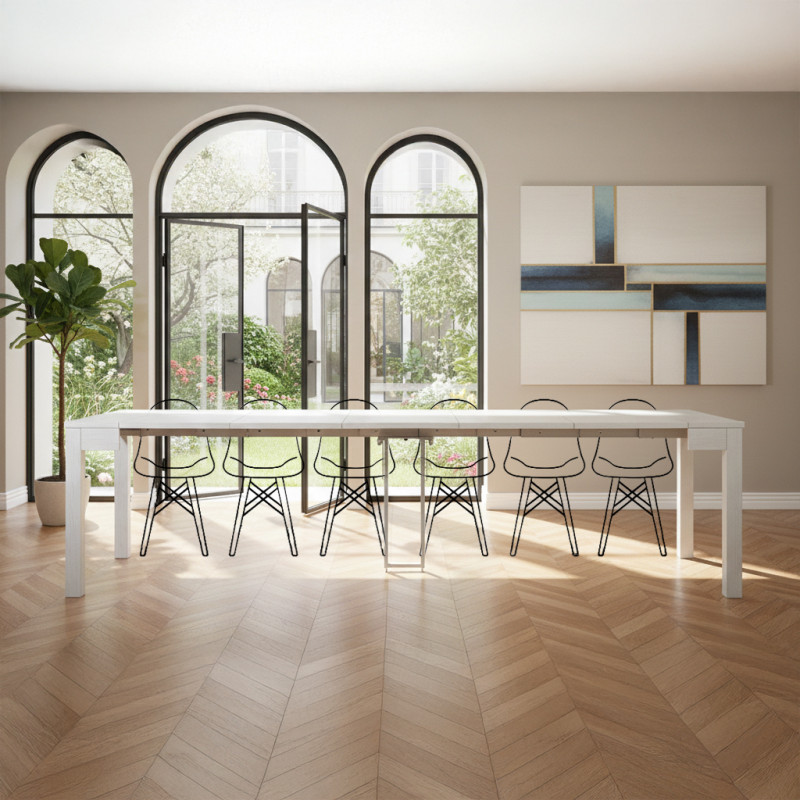 Da mobile d’appoggio compatto (profondo solo 50 cm), si trasforma in un imponente tavolo da pranzo da 3 metri. Grazie al sistema a 5 allunghe esterne, puoi modulare la lunghezza in base alle tue esigenze, ospitando comodamente fino a 14 persone.