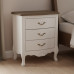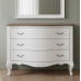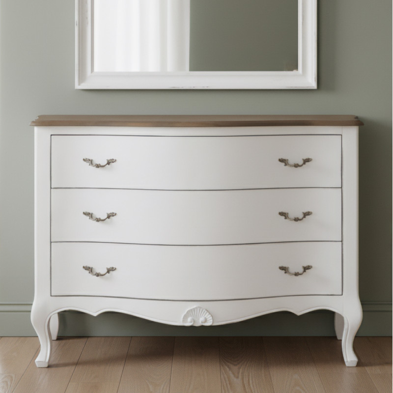 Gruppo notte classico in legno composto da un comò e due comodini. Gambe curve che proseguono con un grembiale sagomato, con dettaglio centrale intagliato. Lato frontale con forma sagomata.