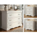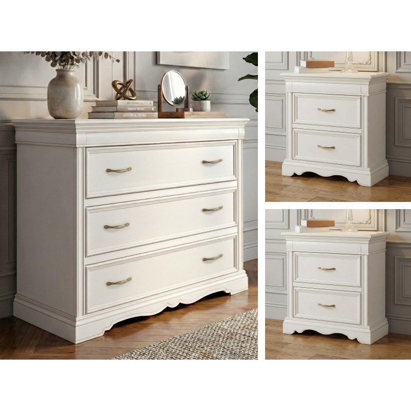 Raffinato set per la zona notte composto da comò e coppia di comodini. Il design classico, impreziosito da sagomature artigianali e maniglie vintage, garantisce stile e massima funzionalità.