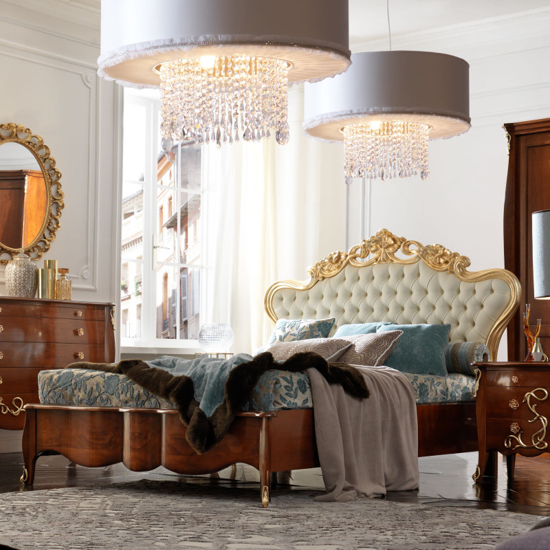La collezione Barocco Charme è presentata in due differenti colorazioni. Abbiamo una finitura in tinta noce con gli intagli rivestiti in foglia oro e una finitura laccata coprente con una leggera patina. In questo caso l’effetto tono su tono dei rilievi è elegante e delicato al tempo stesso. La collezione Barocco Charme è comunque personalizzabile in numerose varianti di colore.