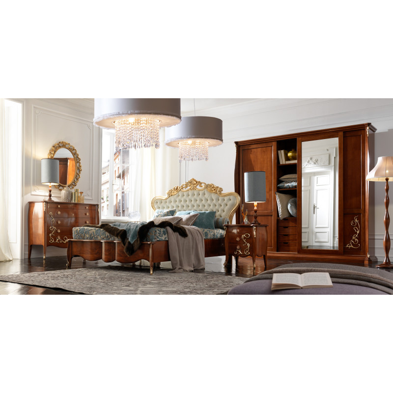 La collezione Barocco Charme è presentata in due differenti colorazioni. Abbiamo una finitura in tinta noce con gli intagli rivestiti in foglia oro e una finitura laccata coprente con una leggera patina. In questo caso l’effetto tono su tono dei rilievi è elegante e delicato al tempo stesso. La collezione Barocco Charme è comunque personalizzabile in numerose varianti di colore.