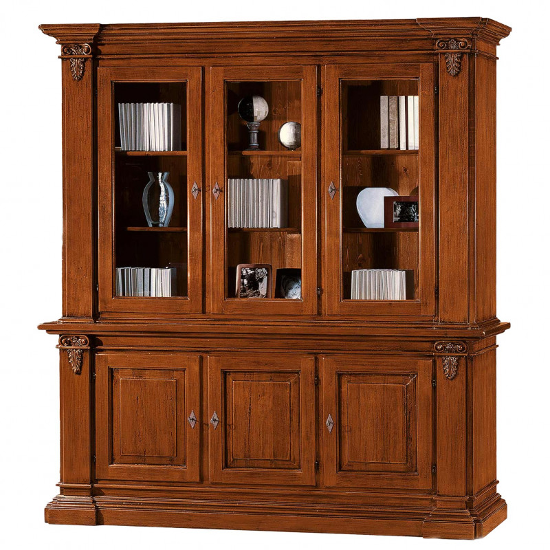 Elegante libreria con alzata in legno massello di pioppo, dotata di tre porte in legno e vetro, ideale per soggiorni classici e raffinati.