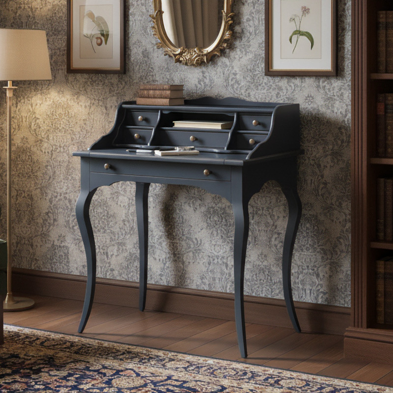 Scrittoio classico in legno con un cassetto grande nella base e un tiretto estraibile che amplia lo spazio disponibile. Alzatina con fianchi sagomati che abbracciano cinque cassettini con un vano a giorno nella parte centrale. Gambe leggermente curve in stile provenzale che raccordano un grembiale a più volute.