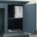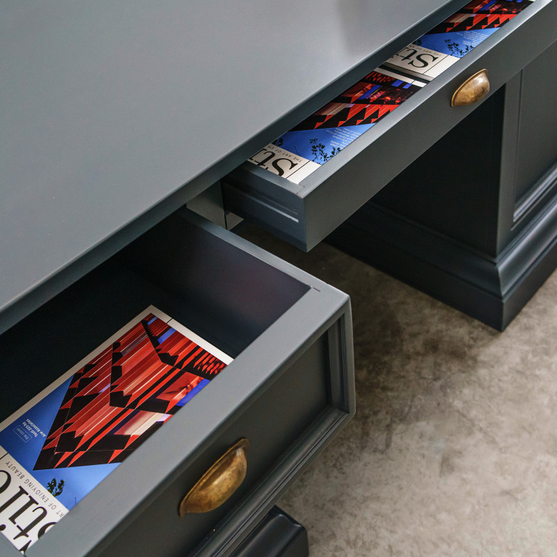 Il piano ampio garantisce uno spazio di lavoro comodo e organizzato, perfetto per documenti, computer e accessori da ufficio. La struttura è arricchita da tre cassetti laterali, ideali per riporre piccoli oggetti e materiale di cancelleria, un cassetto centrale per tenere a portata di mano gli strumenti di uso quotidiano, e una pratica anta che offre uno spazio contenitivo più ampio, adatto ad esempio a raccoglitori e documenti. I pannelli frontali decorati aggiungono un tocco raffinato e scenografico all’ambiente.