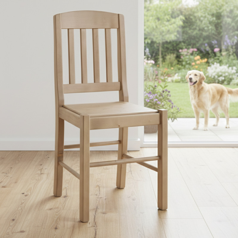 Sedia in legno massello di pino naturale, design classico e robusto. Perfetta per cucina e sala da pranzo, adatta ad arredi rustici e country.