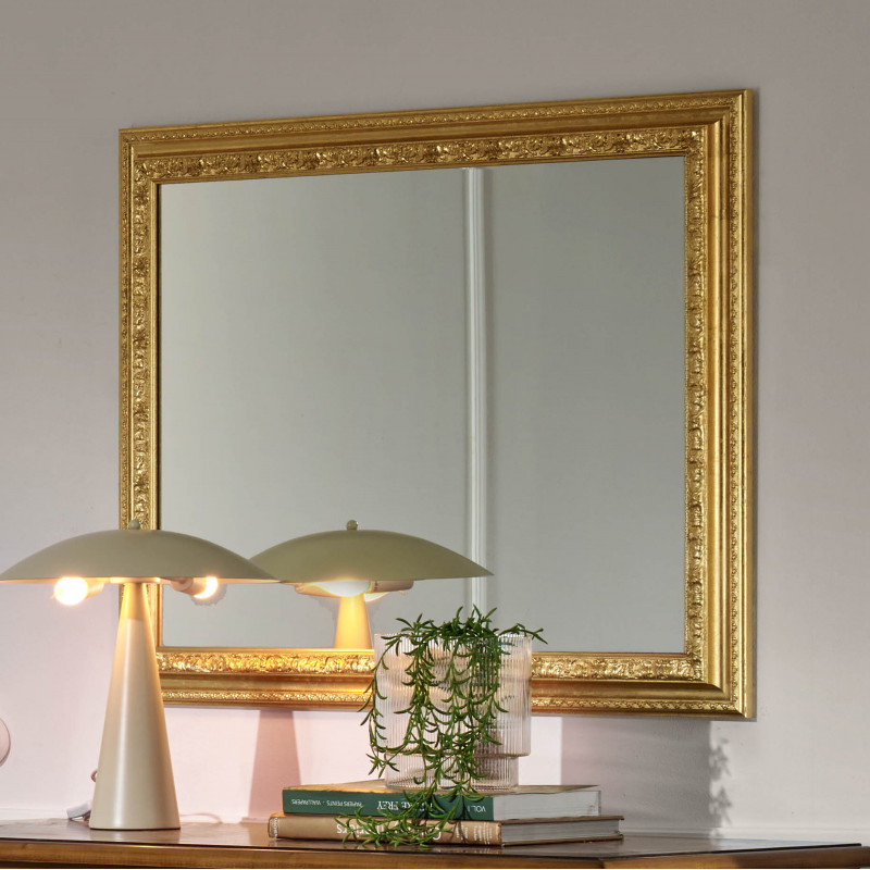 Dettagli di pregio e lavorazione artigianale: la caratteristica distintiva di questo modello risiede nella sua cornice finemente lavorata. La superficie presenta una ricca decorazione a rilievo con motivi classici che corrono lungo tutto il perimetro, incorniciati da modanature lineari che ne esaltano la struttura. La finitura luminosa della cornice cattura e riflette la luce naturale e artificiale, creando giochi di chiaroscuro che mettono in risalto la tridimensionalità dei fregi e donano brillantezza alla stanza.