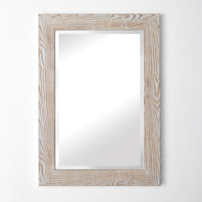 Specchiera rettangolare con cornice in legno di abete, perfetta per arredare camere da letto e soggiorni. Specchio bisellato.