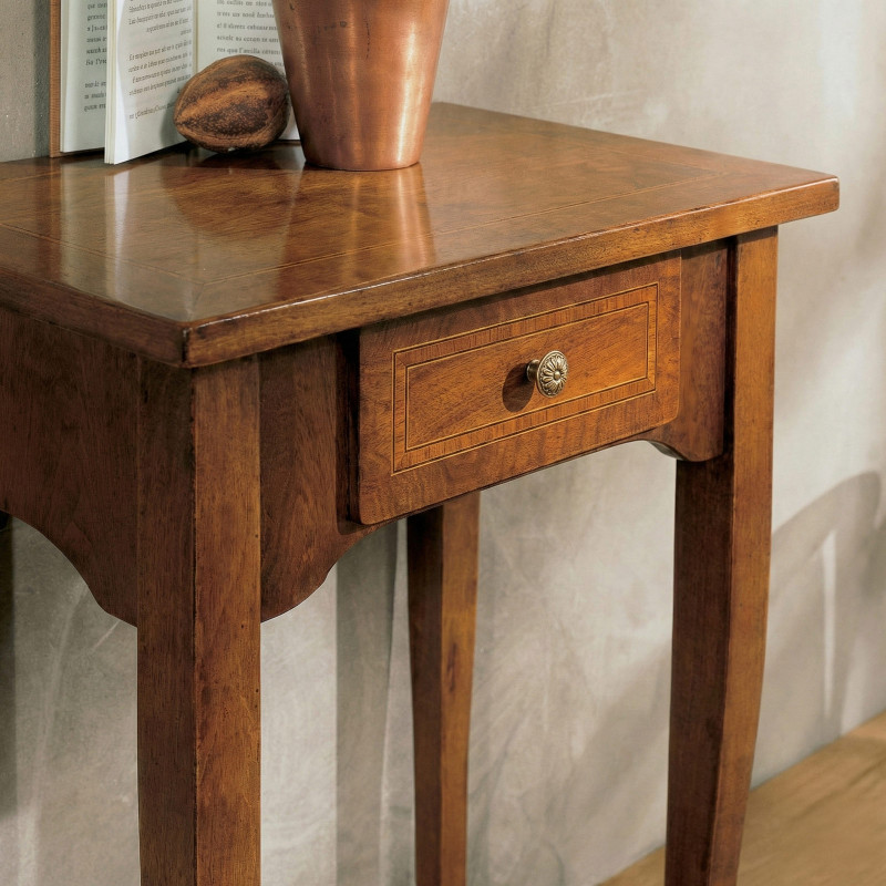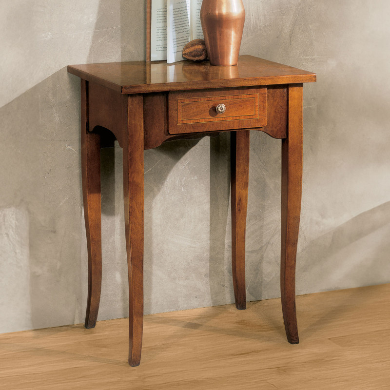 Il punto di forza di questo tavolino risiede nella cura dei dettagli: il frontale del cassetto è impreziosito da un raffinato filetto (intarsio lineare) che incornicia la maniglia, aggiungendo un tocco di classe discreta ma evidente. Il piano d’appoggio offre lo spazio ideale per il telefono, una lampada da tavolo o oggetti decorativi, mentre il cassetto sottostante permette di custodire ordinatamente chiavi, agende o piccoli accessori.