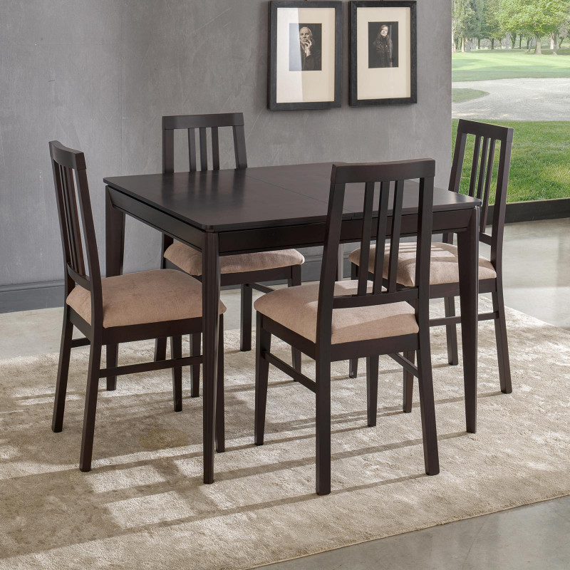 Tavolo quadrato allungabile con allunga centrale da 40 cm, realizzato con piano impiallacciato in legno e gambe in legno massello.