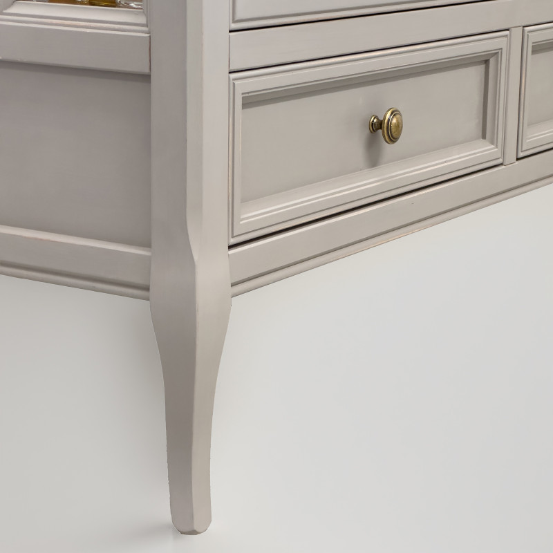 • Dettagli pregiati: montanti e gambe sagomate, cornici lavorate a più sagome su cassetti e fianchi.