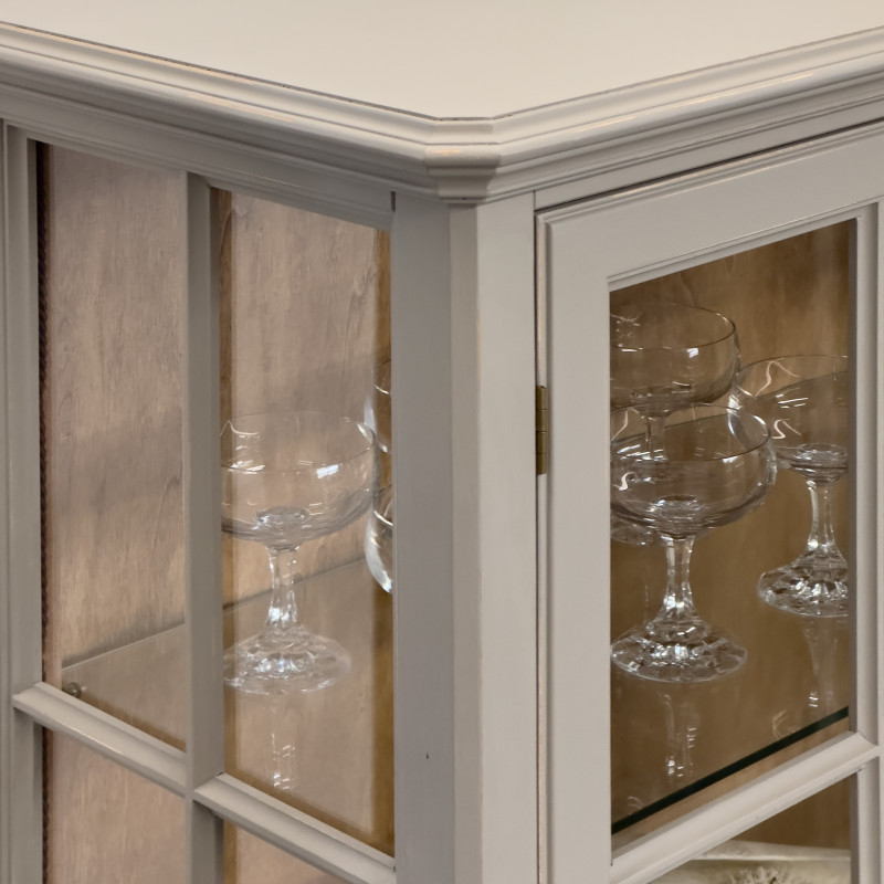 • Vetri: le ante e i fianchi in vetro esaltano l’esposizione di oggetti preziosi, mentre i due ripiani interni in vetro aggiungono praticità e leggerezza visiva.